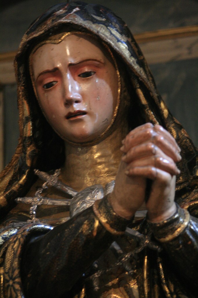De paseo, por las calles marchitas de los recuerdos. Me crucé con una iglesia que sólo vi abierta una vez y allí estaba Ella. Dolorosa de manos unidas a media luz.