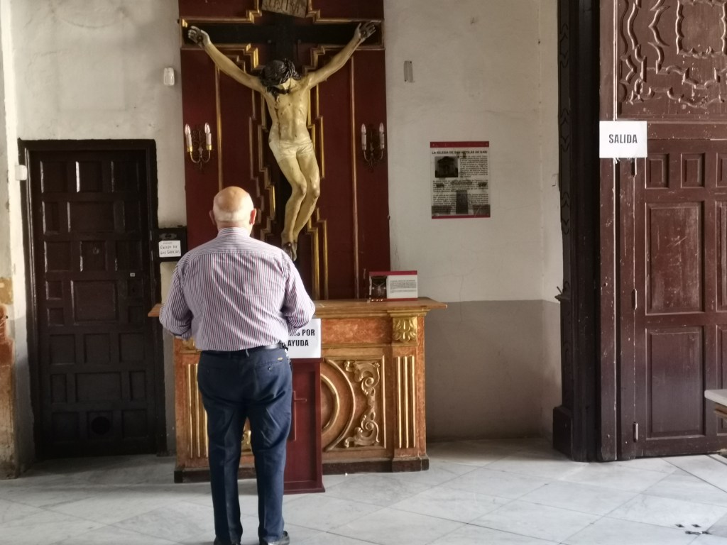 Mascarilla moviendose al ritmo que rezan los labios. Gracias Señor por cuidarnos. Fuera sigue la vida, última mirada al Señor q te cuida…