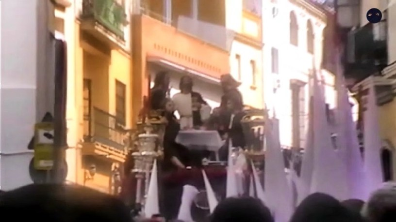 Los 3 pasos de la Hermandad Sacramental de la Sagrada Cena en su transitar por la calle Gerona y revirando en el cruce con Doña María Coronel. Les acompañaron musicalmente: Las Cigarreras, laCoral de María Auxiliadora y la Banda del Maestro Tejera.