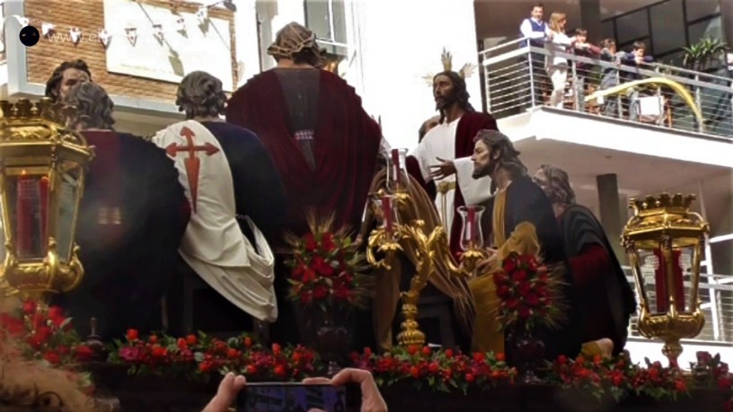 El paso de misterio de la Hdad. de la Sagrada Cena a su paso por calle Imagen (ida) y Plaza de San Pedro (vuelta) a los sones de la Banda de Cornetas y Tambores de las Cigarreras.