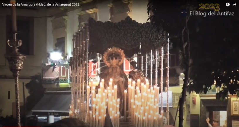 El transitar de los 2 pasos de la Hermandad de la Amargura en la noche del Domingo de Ramos de 2023. Dos videos: en el primero podemos ver el impresionante paso de misterio a los sones de «Soledad de San Pablo», interpretada por la Banda de Cornetas y Tambores de las Tres Caídas de Triana. En el segundo, la Virgen de la Amargura bajo palio, acompañada de San Juan y , musicalmente por la Banda de Música del Carmen de Sateras, que interpreta «La Madrugá».