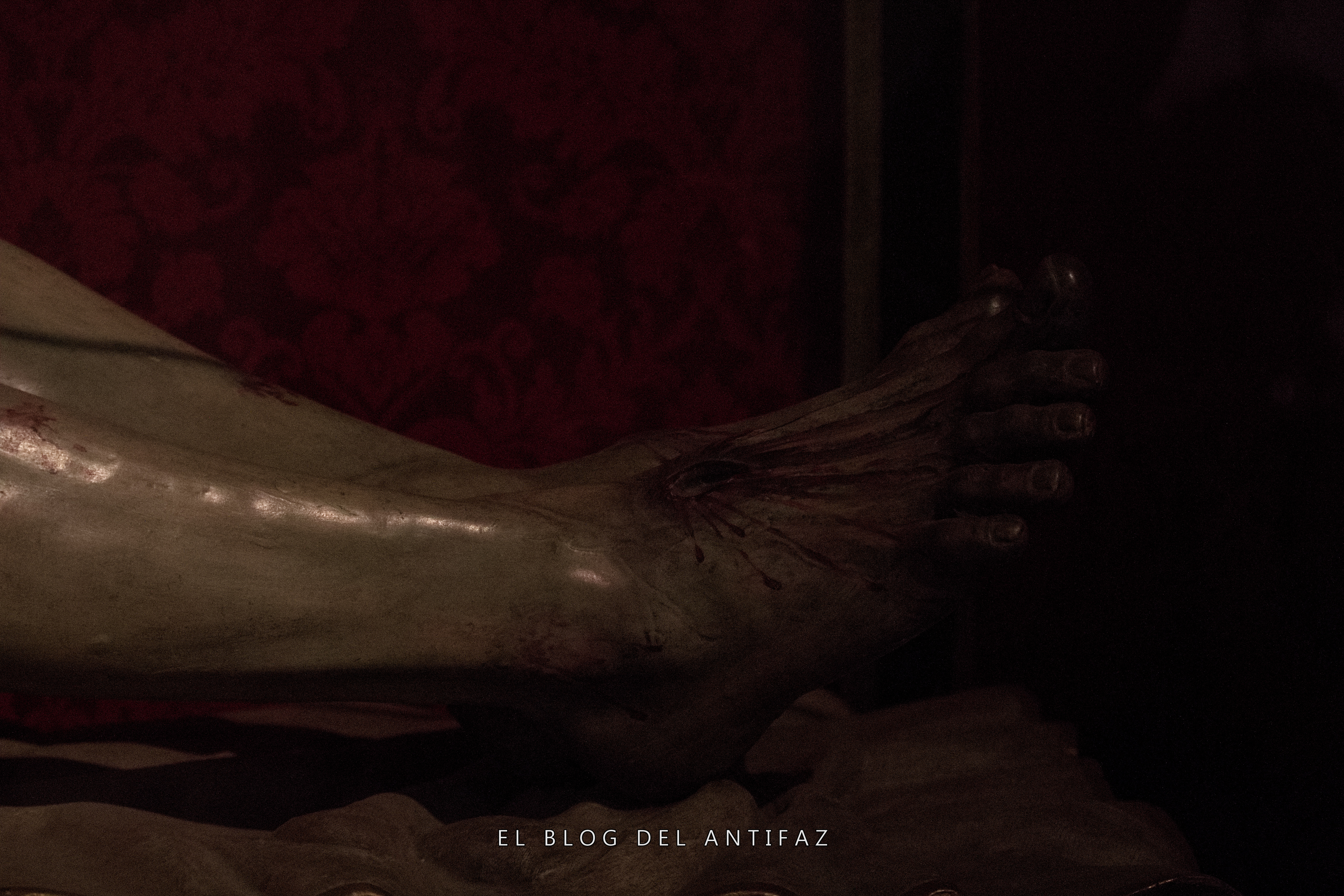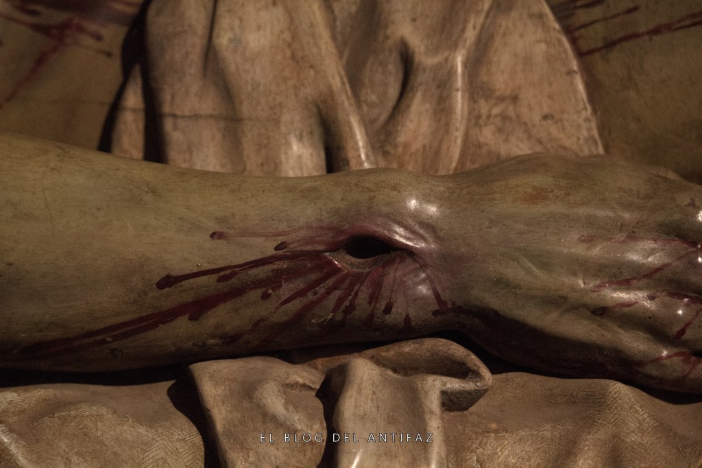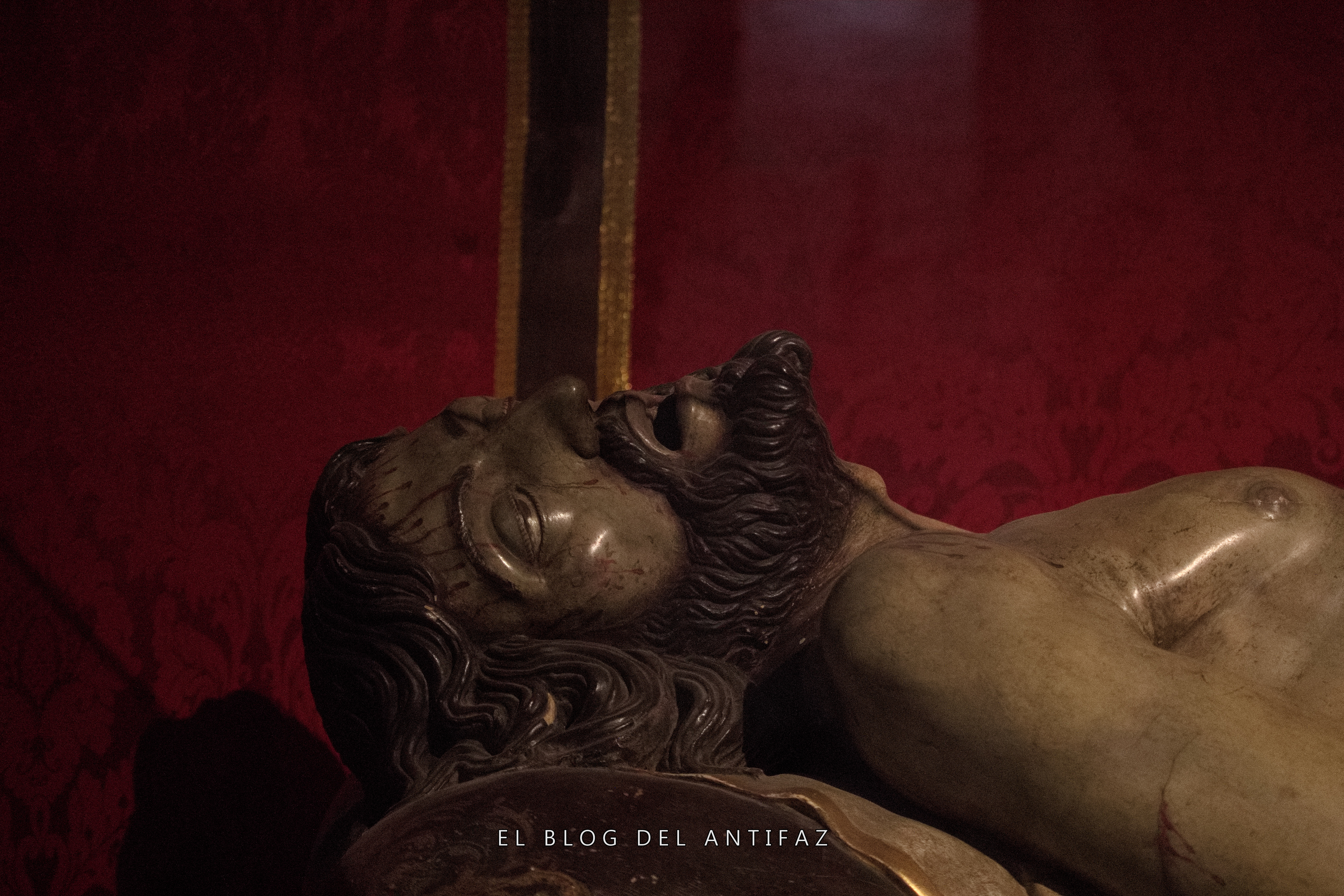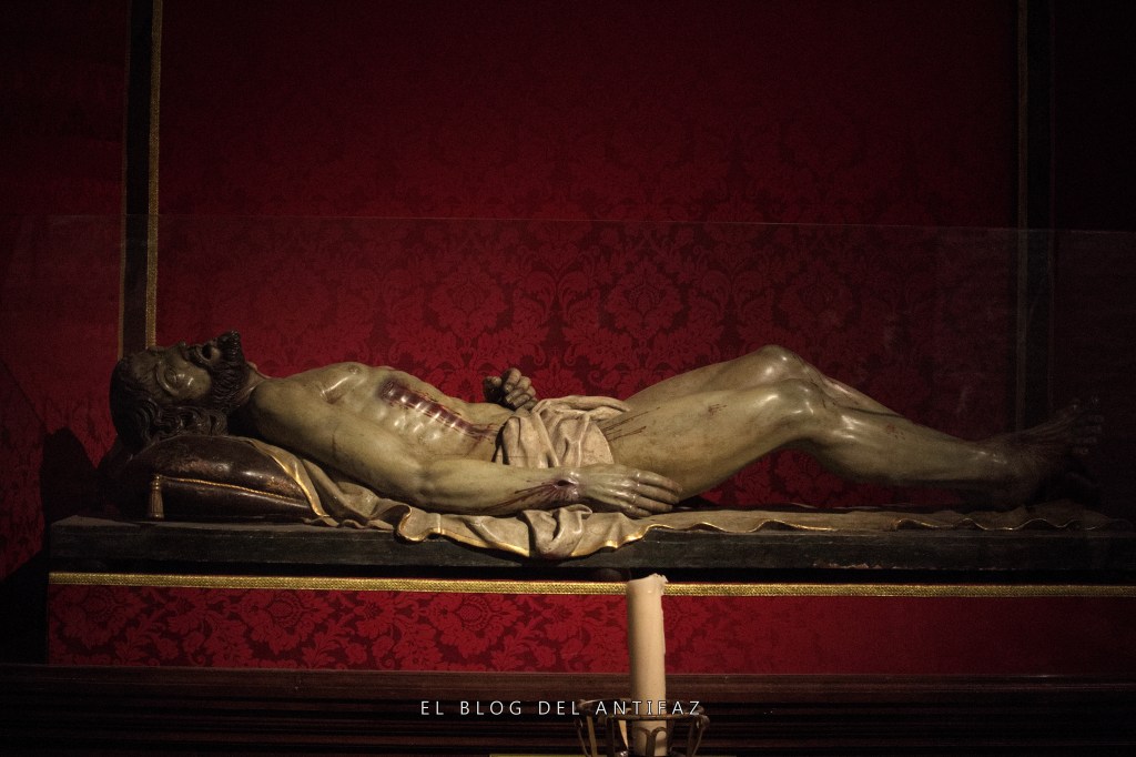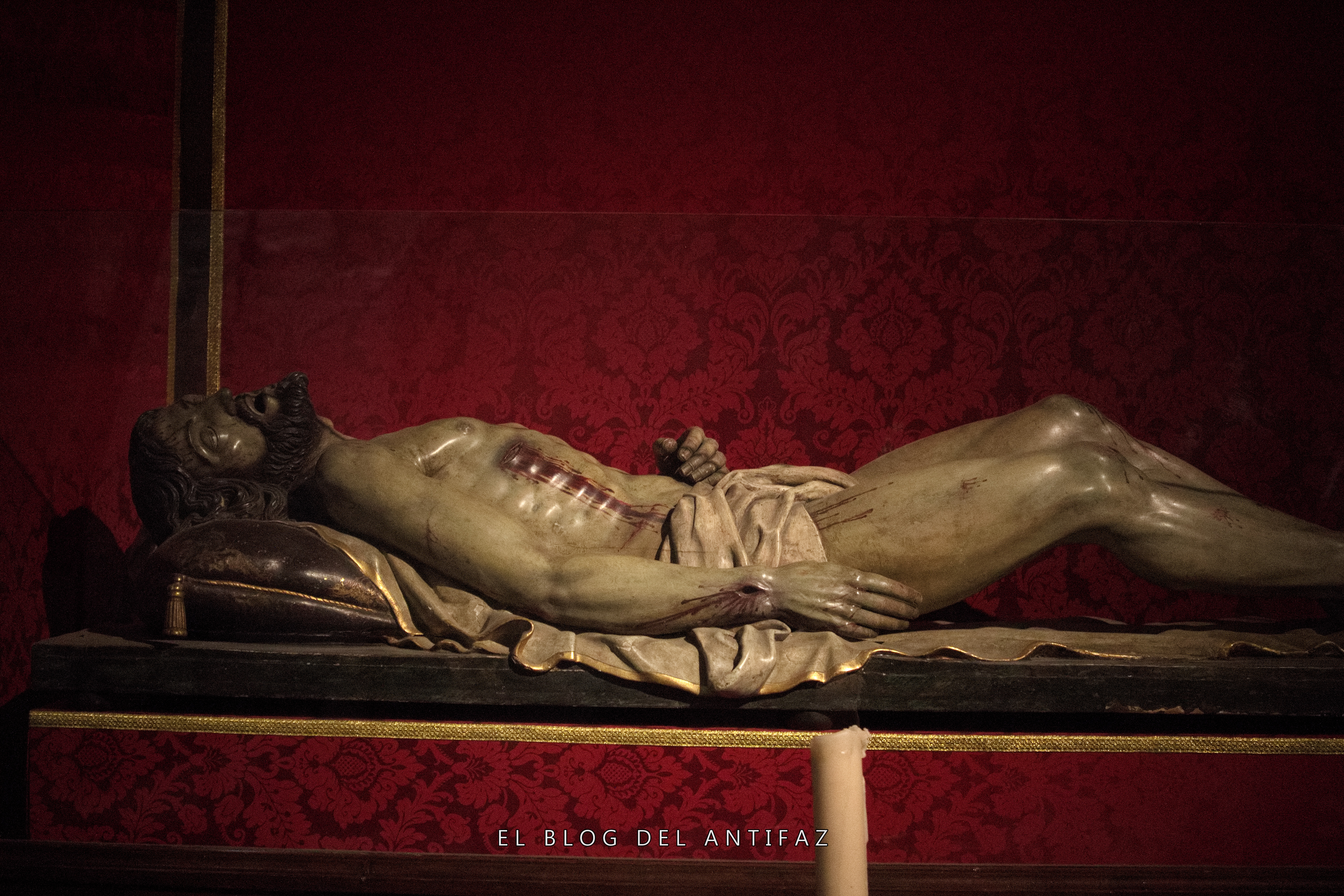 A medida que nos adentramos en la Iglesia de San Marcos, en el lateral derecho podemos encontrar una imagen escultórica: Cristo Yacente de Caritas. Una talla del siglo pasado cuya autoría corresponde al escultor sevillano José Lemus (1926-1990) que tiene también algunas obras significativas, como el famoso monumento a Rodrigo de Triana.