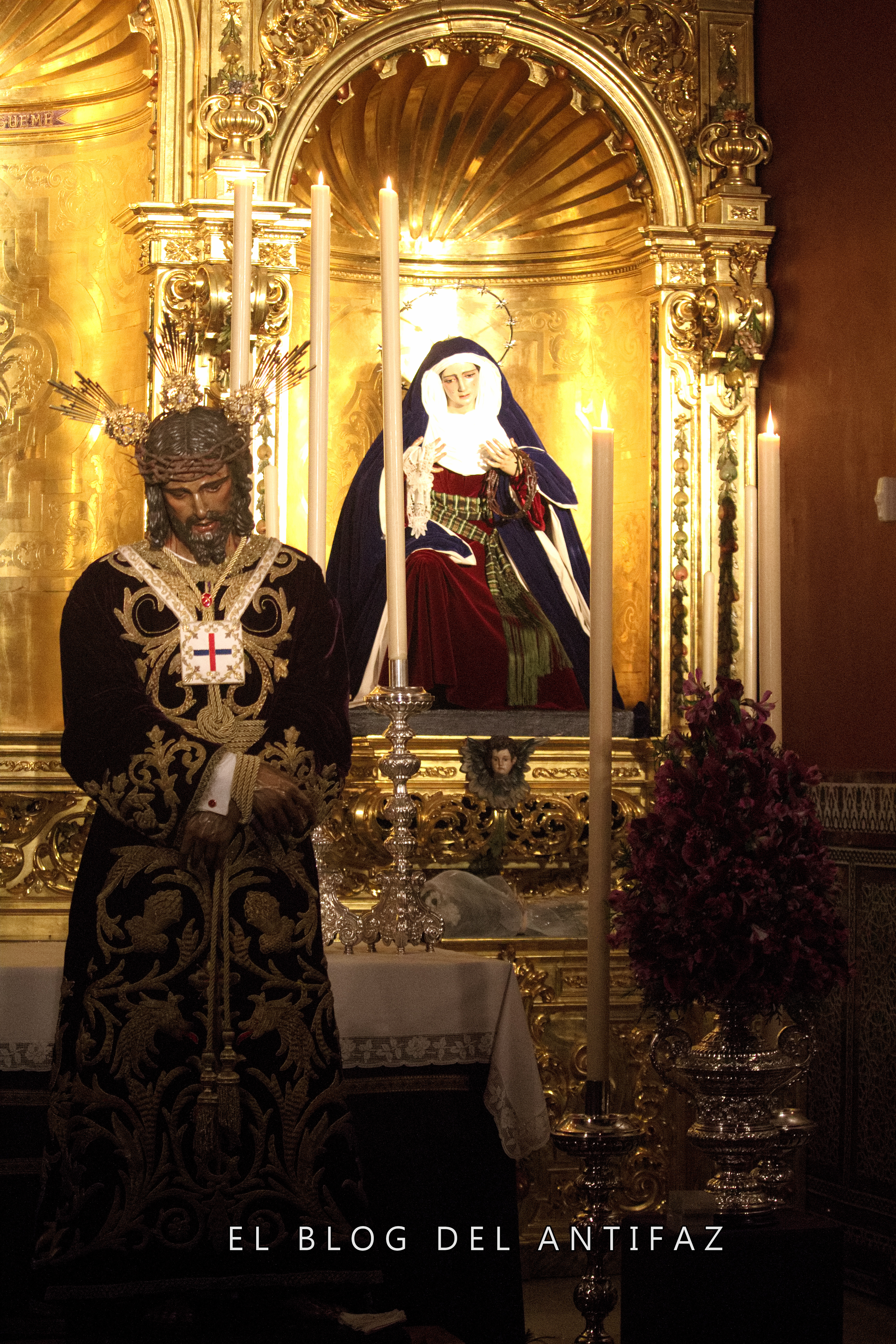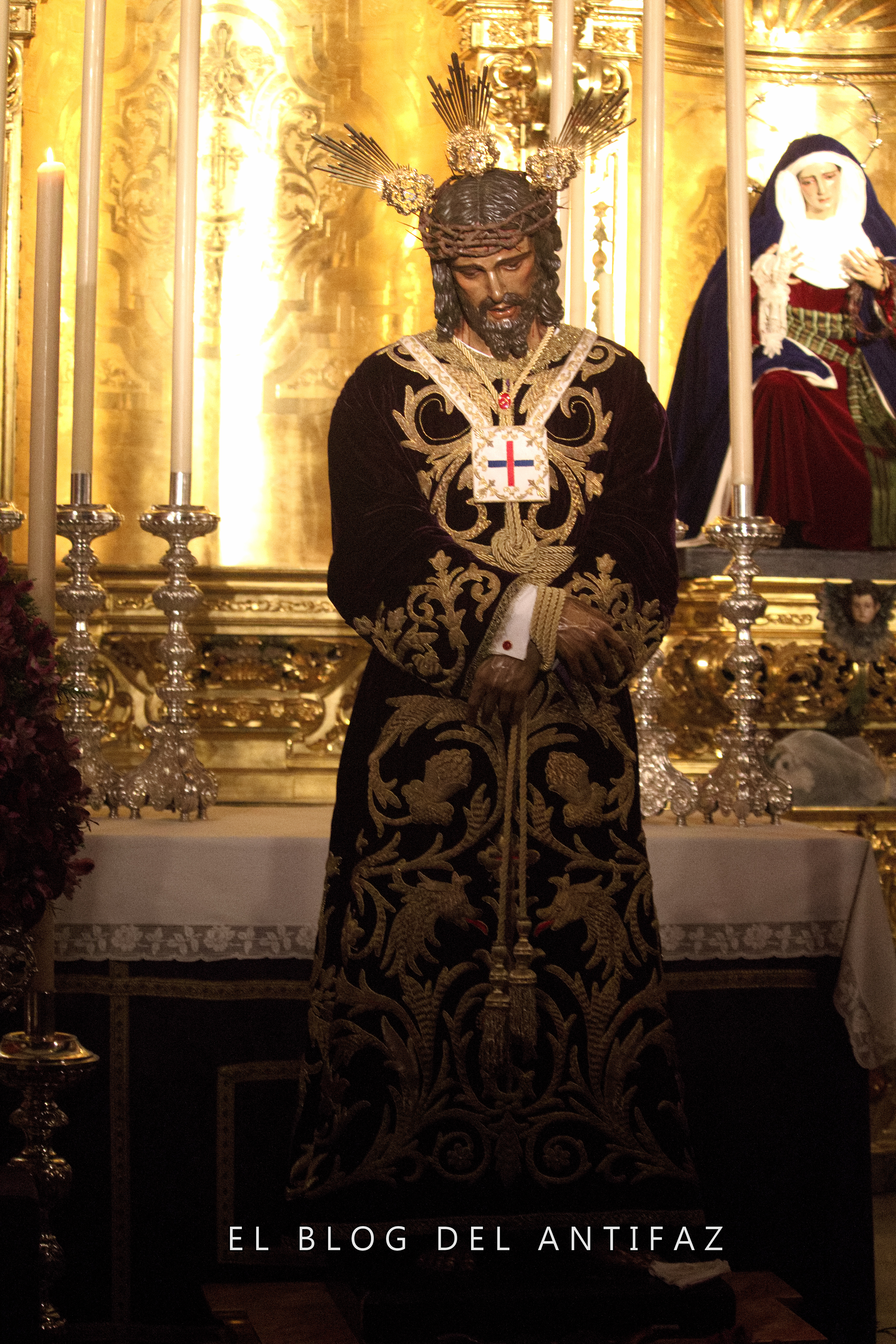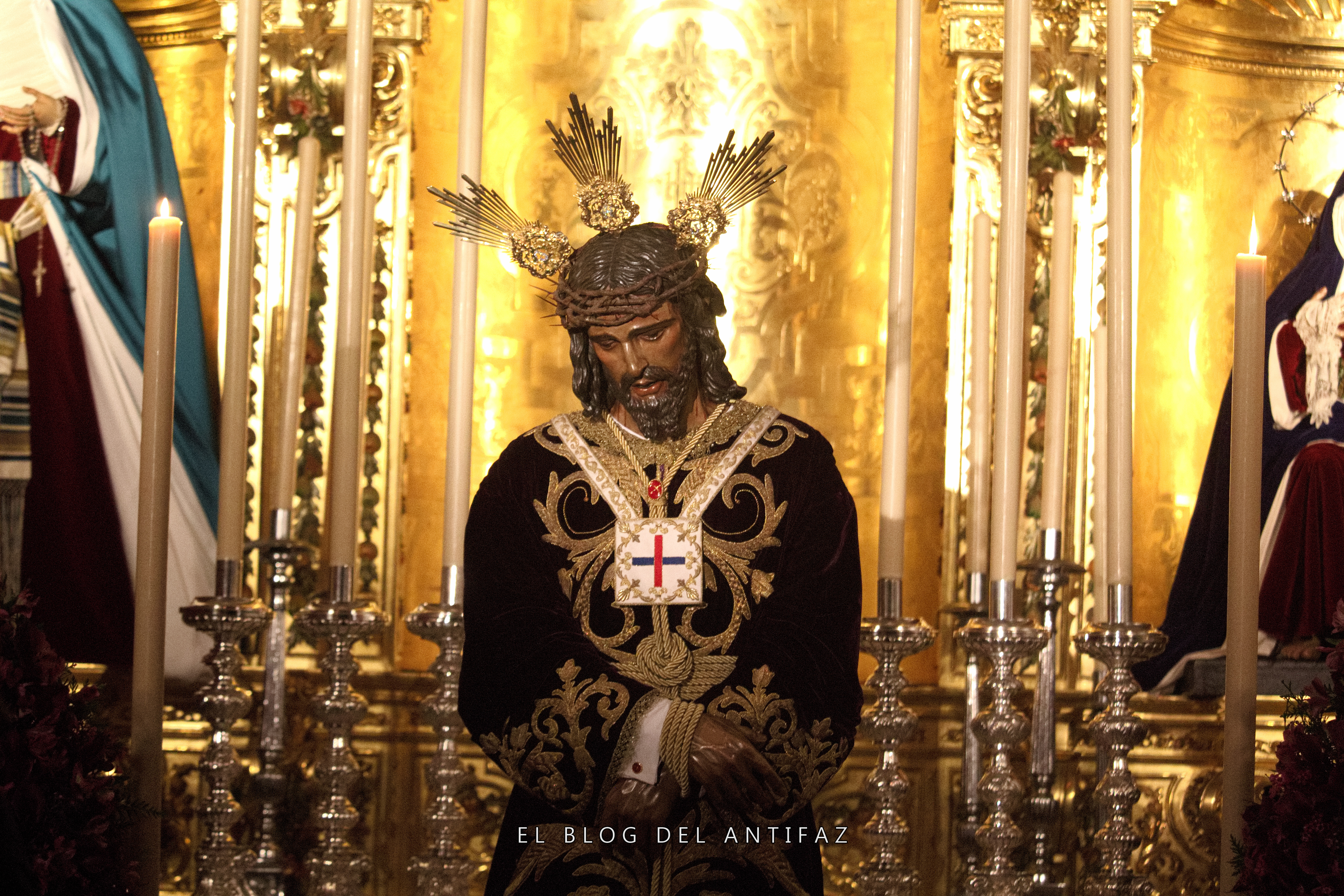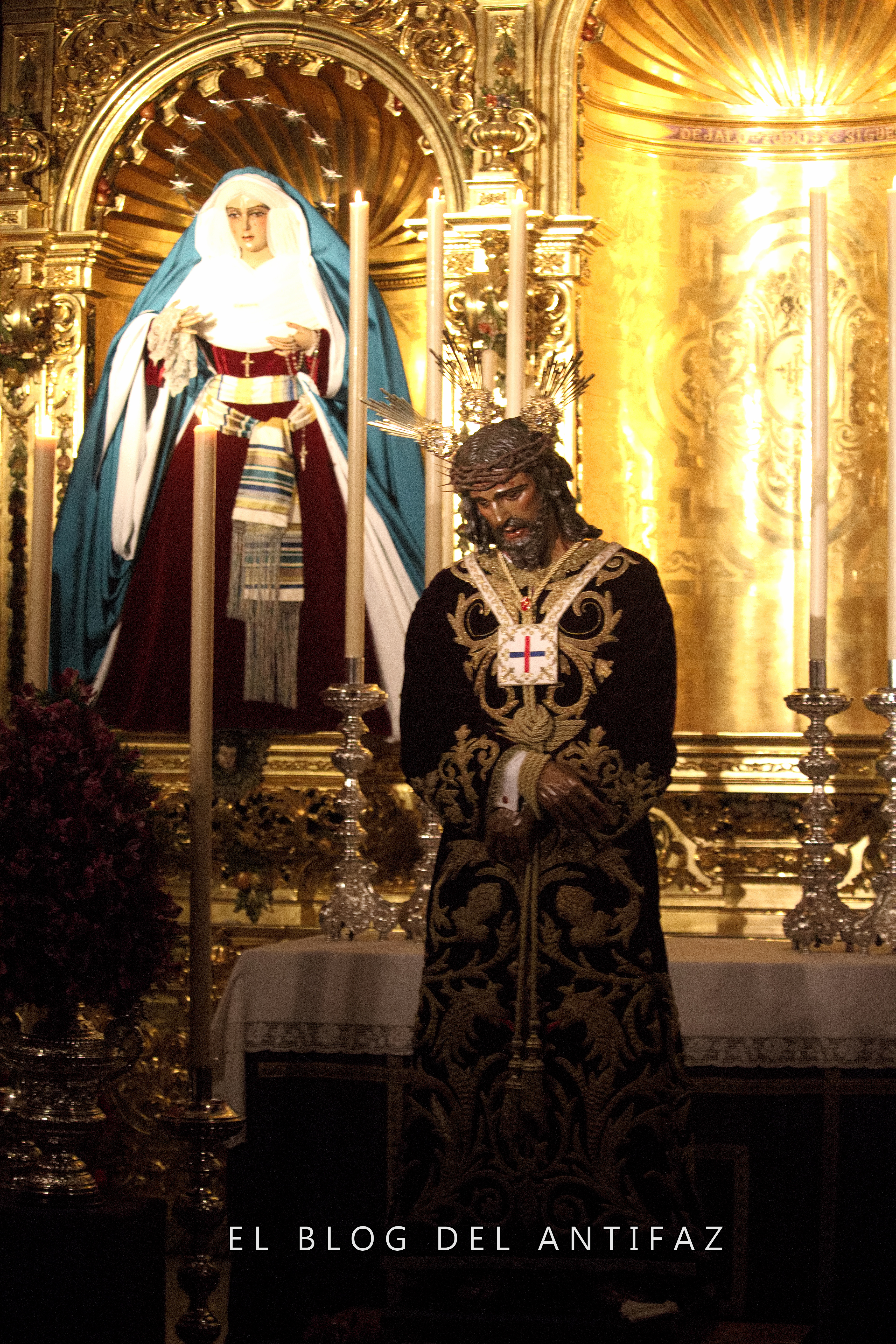 Vestido con la conocida como «túnica de los dragones» de Jesús de Medinaceli (Madrid) se presenta a Ntro. Padre Jesús Cautivo y Rescatado en Solemne Besamanos. Le acompañan en la capilla, y vestidas de hebrea, Ntra. Señora de la Esperanza y María Stma. de los Dolores.